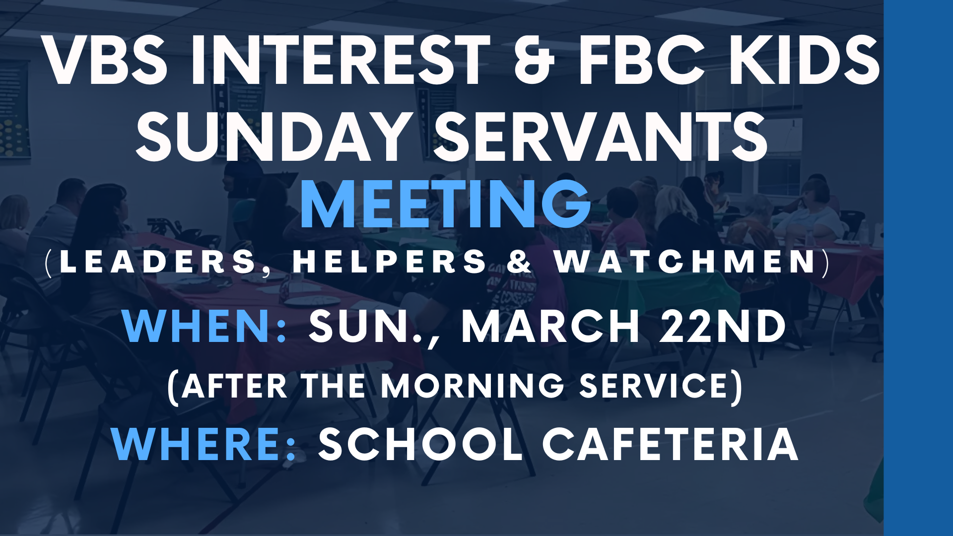 12:15pm VBS interest /FBCKids meeting luncheon 12:15 -1:30 (Choir members attend Choir Practice)