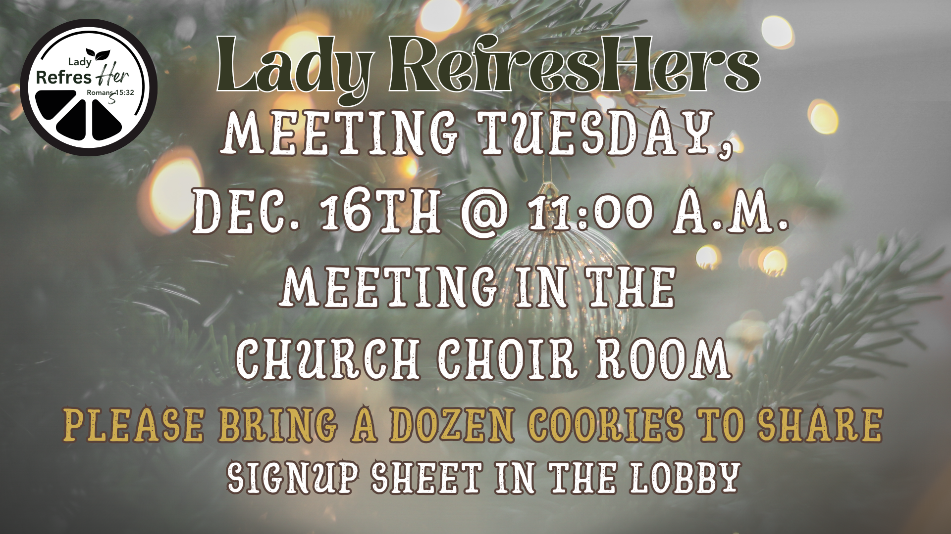 11am Ladies Refreshers 11am Chior Room - sign up sheet for name and type of cookie